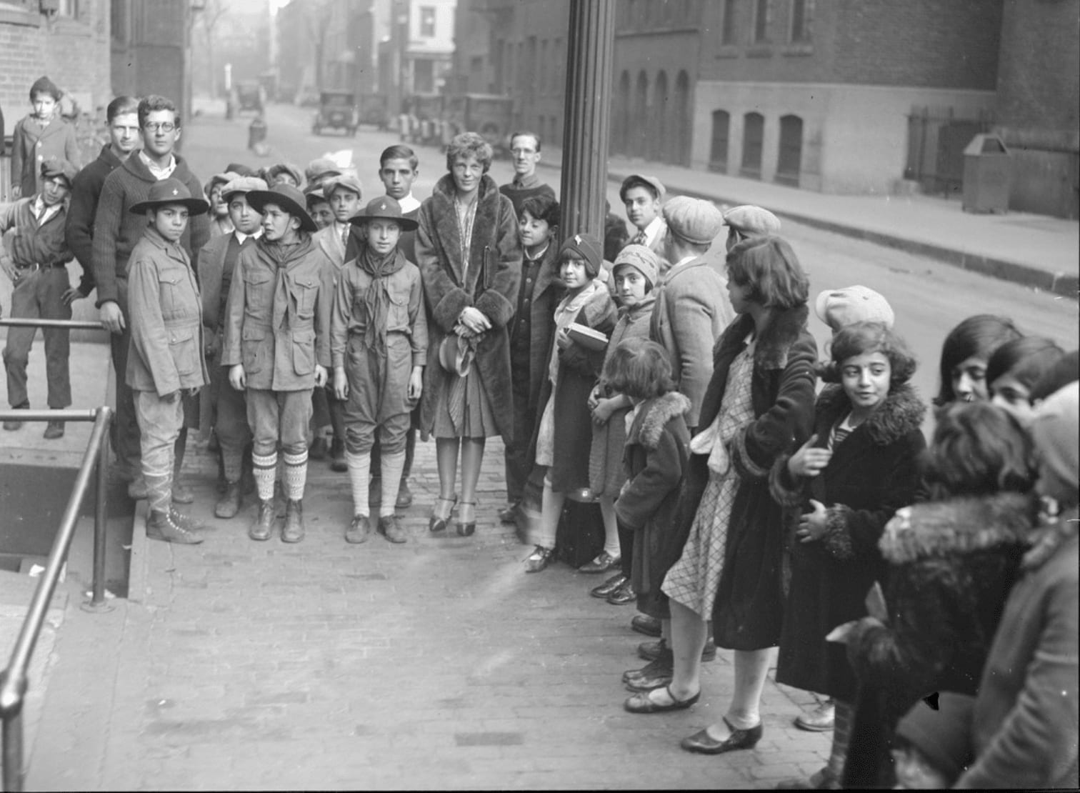 Amelia Earhart returns to Dennison House on Tyler Street where she is greeted by children of all nationalities. Photo: Leslie Jones